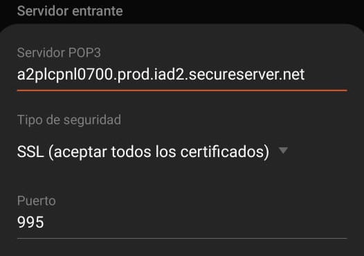 En la sección de ajustes de entrada, ingresa la dirección a2plcpnl0700.prod.iad2.secureserver.net en el campo de Servidor IMAP. Los demás campos puedes dejarlos con el valor que tengan por defecto.