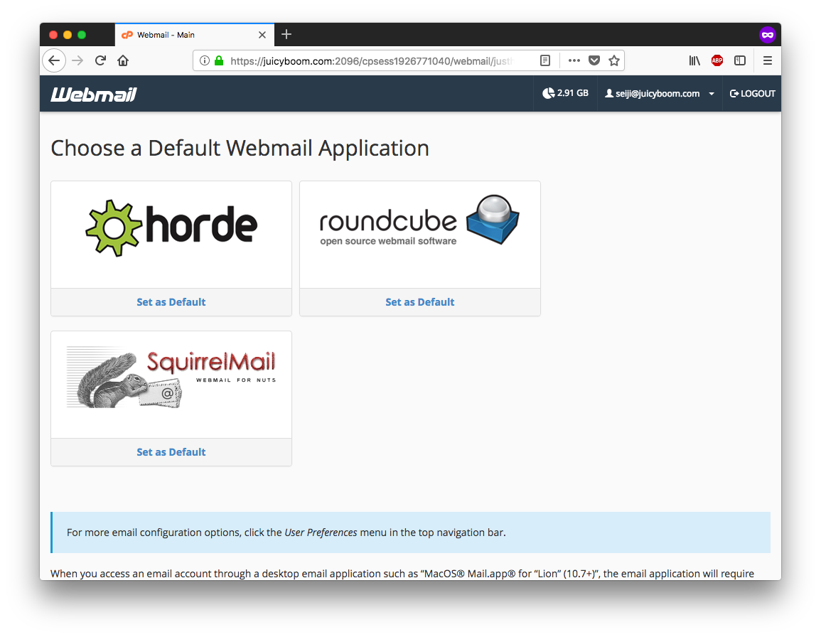 Si es la primera vez que ingresas, te pedirá que indiques la aplicación con la que deseas entrar. Nosotros recomendamos roundcube. Si seleccionas "Set as Default" entrará automáticamente las próximas veces.